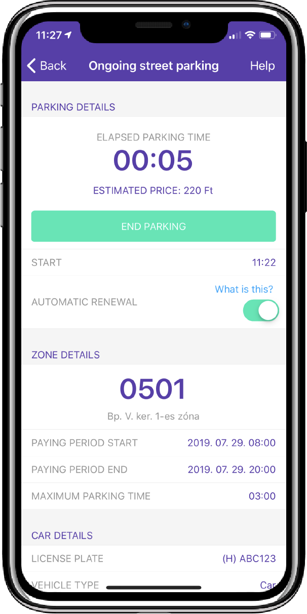 before starting your parking on the Parking zone profile screen. Your parking will