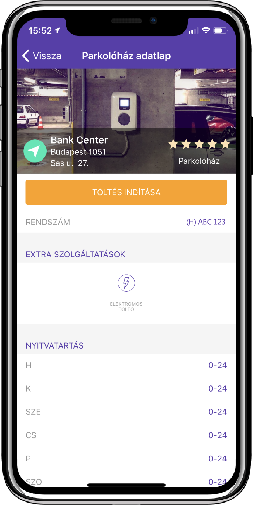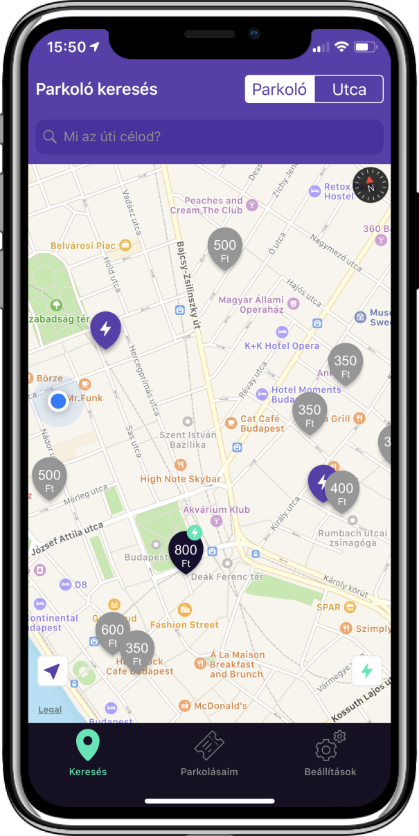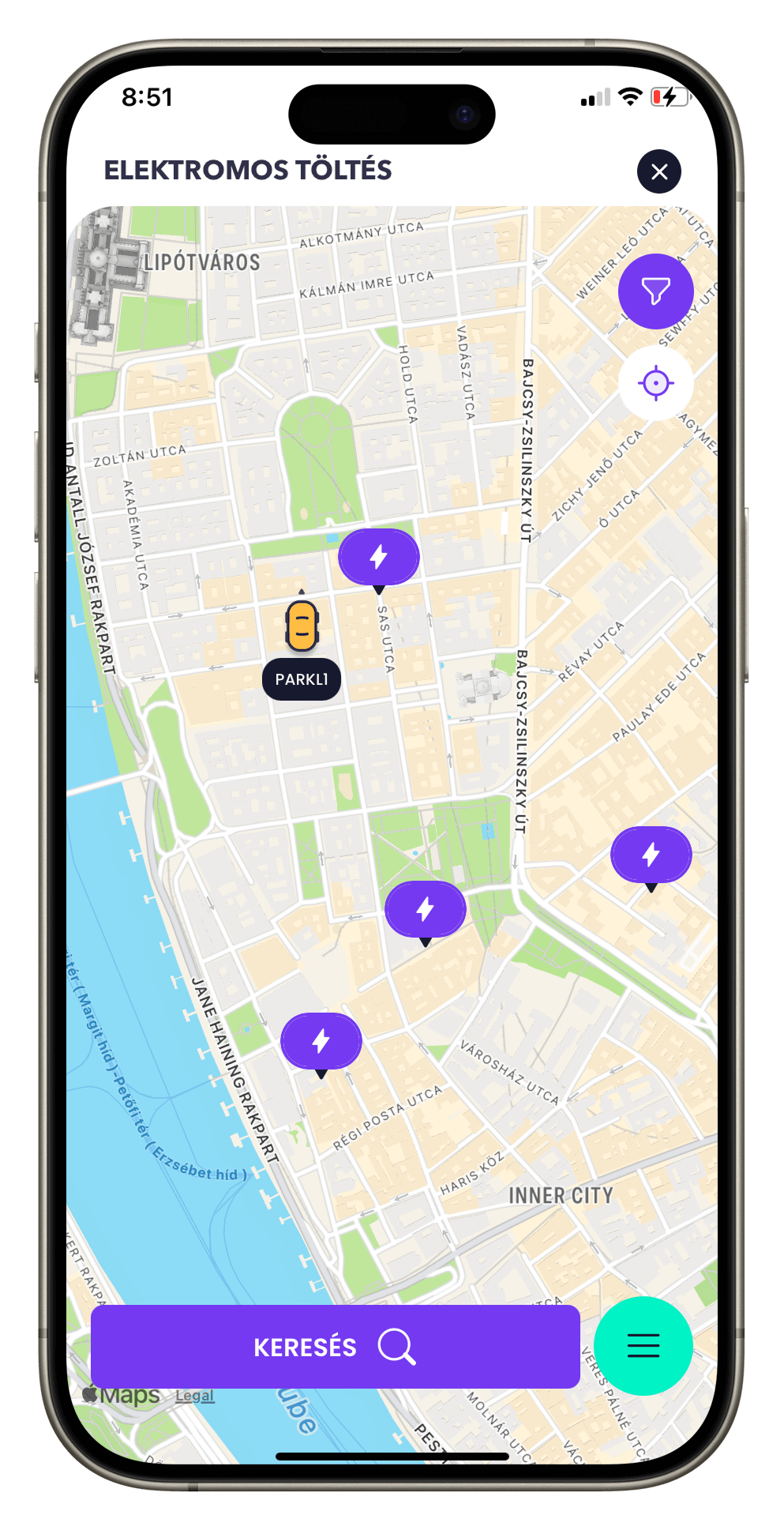 Az alkalmazás Parkoló térképén a lila alapon villám jelzésű ikon mutatja a Parkl töltőpontokat és a fekete alapon zöld villám jelzés azokat a helyszíneket, ahol a zárt téri parkolás és elektromos töltés funkció is igénybe vehető az appon keresztül. A térkép jobb alsó sarkában található villám jelzésre kattintva lehet szűrni, hogy csak azok a helyek jelenjenek meg ahol elérhető az elektromos töltés funkció.